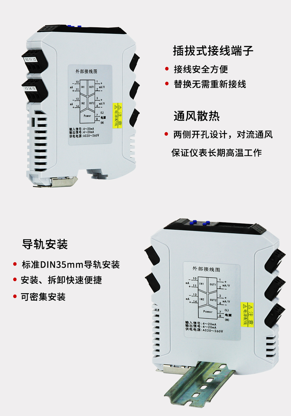 虹潤(rùn)公司是專業(yè)生產(chǎn)隔離器的國(guó)家專精特新“小巨人”企業(yè)。生產(chǎn)的導(dǎo)軌式智能隔離器 ,具有高清顯示單元,參數(shù)可設(shè)置,寬電源供電,響應(yīng)快,帶RS485通訊等特點(diǎn)。產(chǎn)品獲得信號(hào)隔離器、一種二端子模塊、無(wú)源信號(hào)隔離器等3項(xiàng)國(guó)家發(fā)明專利,主持起草現(xiàn)場(chǎng)設(shè)備工具(FDT)接口規(guī)范、工業(yè)過(guò)程測(cè)量和控制系統(tǒng)用隔離式安全柵、工業(yè)過(guò)程測(cè)量和控制系統(tǒng)用配電器等3項(xiàng)國(guó)家標(biāo)準(zhǔn),以及通信系統(tǒng)多通道數(shù)據(jù)采集控制終端規(guī)范軍用標(biāo)準(zhǔn),參與國(guó)際5G標(biāo)準(zhǔn)制定,取得智能隔離器等2項(xiàng)相關(guān)軟件著作權(quán)。產(chǎn)品廣泛應(yīng)用于電力、石化,冶金、制藥、水處理、機(jī)械配套等各種工業(yè)現(xiàn)場(chǎng)。