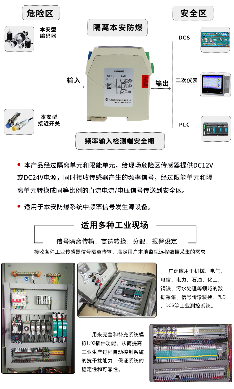 虹潤(rùn)公司是專業(yè)生產(chǎn)隔離器的國(guó)家專精特新“小巨人”企業(yè)。生產(chǎn)的隔離式安全柵涵蓋信號(hào)頻率輸入、電壓輸入、電流輸入、熱電阻輸入、熱電偶輸入、開(kāi)關(guān)量輸入等多種產(chǎn)品類型。產(chǎn)品獲得具備減震抗干擾能力的溫度變送器、信號(hào)隔離器、一種二端子模塊、無(wú)源信號(hào)隔離器等4項(xiàng)國(guó)家發(fā)明專利,主持起草物聯(lián)網(wǎng)智能溫度儀表、現(xiàn)場(chǎng)設(shè)備工具(FDT)接口規(guī)范、工業(yè)過(guò)程測(cè)量和控制系統(tǒng)用溫度變送器等3項(xiàng)國(guó)家標(biāo)準(zhǔn),以及通信系統(tǒng)多通道數(shù)據(jù)采集控制終端規(guī)范軍用標(biāo)準(zhǔn)。參與國(guó)際5G標(biāo)準(zhǔn)制定,取得智能隔離式安全柵等4項(xiàng)相關(guān)軟件著作權(quán)。產(chǎn)品廣泛應(yīng)用于石油、電力、化工,冶金、智能制造、污水處理等諸多行業(yè)。