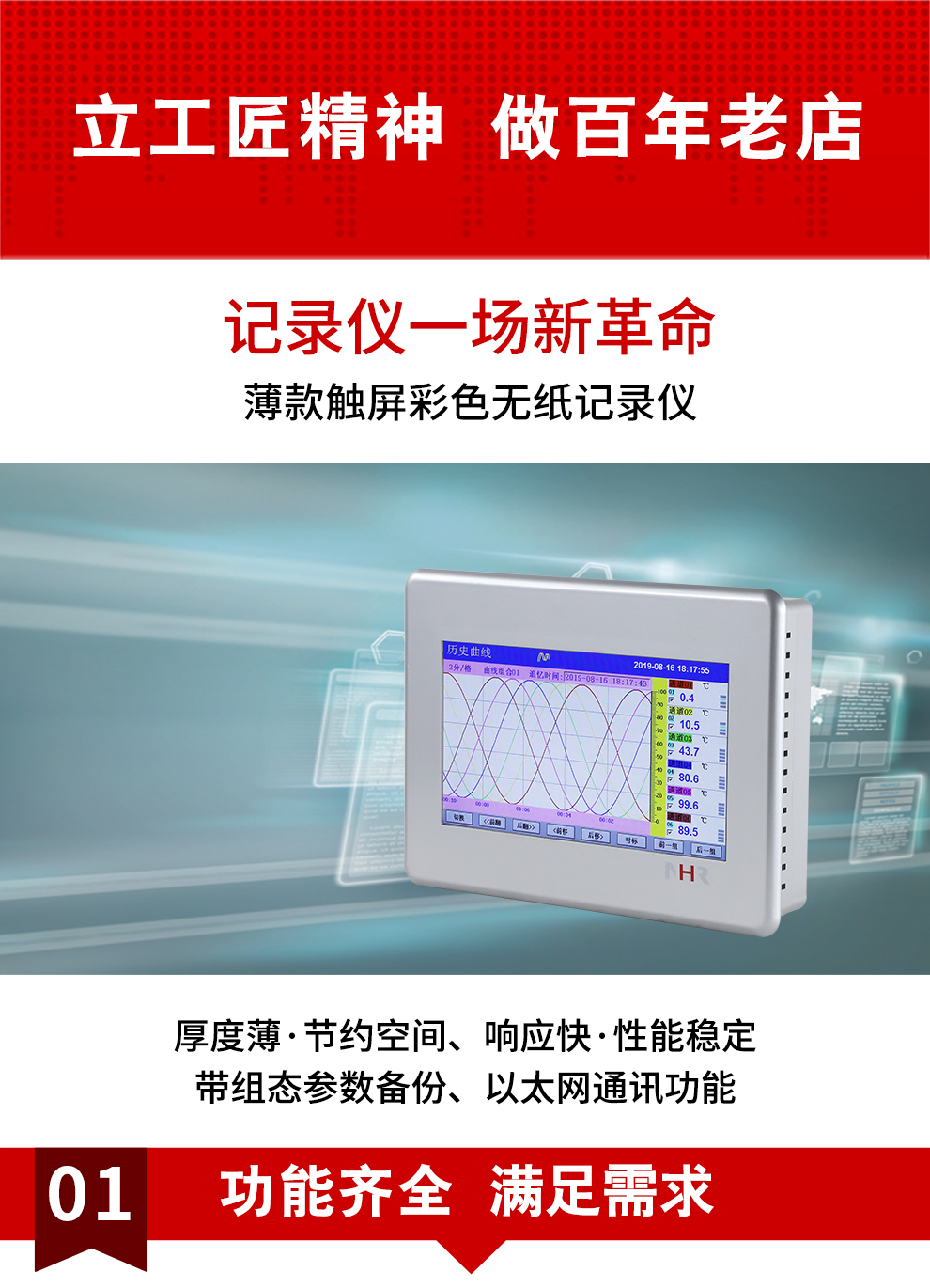 虹潤公司是專業(yè)生產(chǎn)無紙記錄儀的國家專精特新“小巨人”企業(yè)。生產(chǎn)的觸摸屏無紙記錄儀,具有觸摸大屏顯示,多通道全切換輸入,數(shù)據(jù)記錄與轉(zhuǎn)存, RS485/以太網(wǎng)通訊,5/7/9英寸可選等特點(diǎn)。產(chǎn)品獲得一種無紙記錄儀、數(shù)據(jù)采集控制工作站、智能化控制器、巡回檢測顯示方法及裝置等4項(xiàng)國家發(fā)明專利,主持起草物聯(lián)網(wǎng)智能記錄儀表通用技術(shù)條件、物聯(lián)網(wǎng)智能溫度儀表通用技術(shù)條件等2項(xiàng)國家標(biāo)準(zhǔn),通信系統(tǒng)多通道數(shù)據(jù)采集控制終端規(guī)范軍用標(biāo)準(zhǔn),以及空間數(shù)據(jù)與信息數(shù)據(jù)傳輸系統(tǒng)等2項(xiàng)航天標(biāo)準(zhǔn),參與國際5G標(biāo)準(zhǔn)制定,取得觸摸屏彩色無紙記錄儀等4項(xiàng)相關(guān)軟件著作權(quán)。產(chǎn)品廣泛應(yīng)用于冶金、石化、電力、制藥、新能源、現(xiàn)代農(nóng)業(yè)、生產(chǎn)過程等諸多領(lǐng)域。