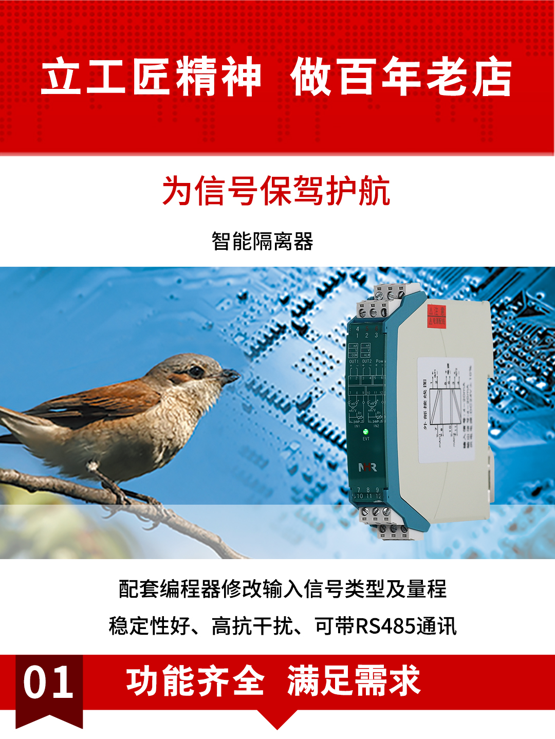 虹潤(rùn)公司是專業(yè)生產(chǎn)隔離器的國(guó)家專精特新“小巨人”企業(yè)。生產(chǎn)的智能信號(hào)隔離器涵蓋電流電壓變送器、溫度變送器、配電器、頻率轉(zhuǎn)換器、開關(guān)量轉(zhuǎn)換器及通訊轉(zhuǎn)換器等多種產(chǎn)品類型。產(chǎn)品獲得信號(hào)隔離器、一種二端子模塊、無源信號(hào)隔離器等3項(xiàng)國(guó)家發(fā)明專利,主持起草現(xiàn)場(chǎng)設(shè)備工具(FDT)接口規(guī)范、工業(yè)過程測(cè)量和控制系統(tǒng)用隔離式安全柵、工業(yè)過程測(cè)量和控制系統(tǒng)用配電器等3項(xiàng)國(guó)家標(biāo)準(zhǔn),以及通信系統(tǒng)多通道數(shù)據(jù)采集控制終端規(guī)范軍用標(biāo)準(zhǔn),參與國(guó)際5G標(biāo)準(zhǔn)制定,取得導(dǎo)軌式智能隔離器、頻率轉(zhuǎn)換器等3項(xiàng)相關(guān)軟件著作權(quán)。產(chǎn)品廣泛電力、冶金、工業(yè)電爐、變電站、高壓電機(jī)房等需要電隔離的工業(yè)自動(dòng)化控制系統(tǒng)。
