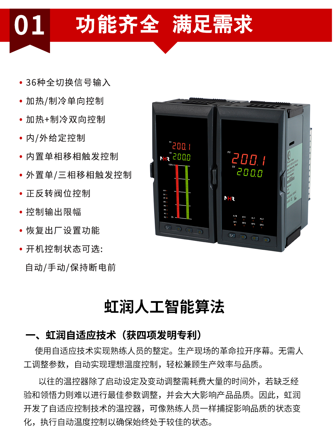 虹潤公司是專業(yè)生產(chǎn)溫控器的國家專精特新“小巨人”企業(yè)。生產(chǎn)的人工智能溫控器,具有真正人工智能算式,無需人工整定參數(shù),控制精度可達±0.1°C,多種輸出類型,高抗干擾等特點。產(chǎn)品獲得模糊PID控制儀及控制方法、人工智能調(diào)節(jié)器、智能化控制器、移相觸發(fā)控制器、閥門自動手動無擾動操作控制方法及裝置等5項國家發(fā)明專利,主持起草工業(yè)過程控制系統(tǒng)用模擬輸入兩位或多位輸出儀表、物聯(lián)網(wǎng)智能溫度儀表通用技術(shù)條件、工業(yè)過程測量和控制系統(tǒng)用智能調(diào)節(jié)器等3項國家標準,以及通信系統(tǒng)多通道數(shù)據(jù)采集控制終端規(guī)范軍用標準,參與國際5G標準制定,取得模糊PID溫控儀等3項相關(guān)軟件著作權(quán)。產(chǎn)品廣泛應(yīng)用于電力、石化,冶金、制藥、食品等幾乎所有工業(yè)現(xiàn)場,實現(xiàn)精準控溫,保障生產(chǎn)安全與質(zhì)量。