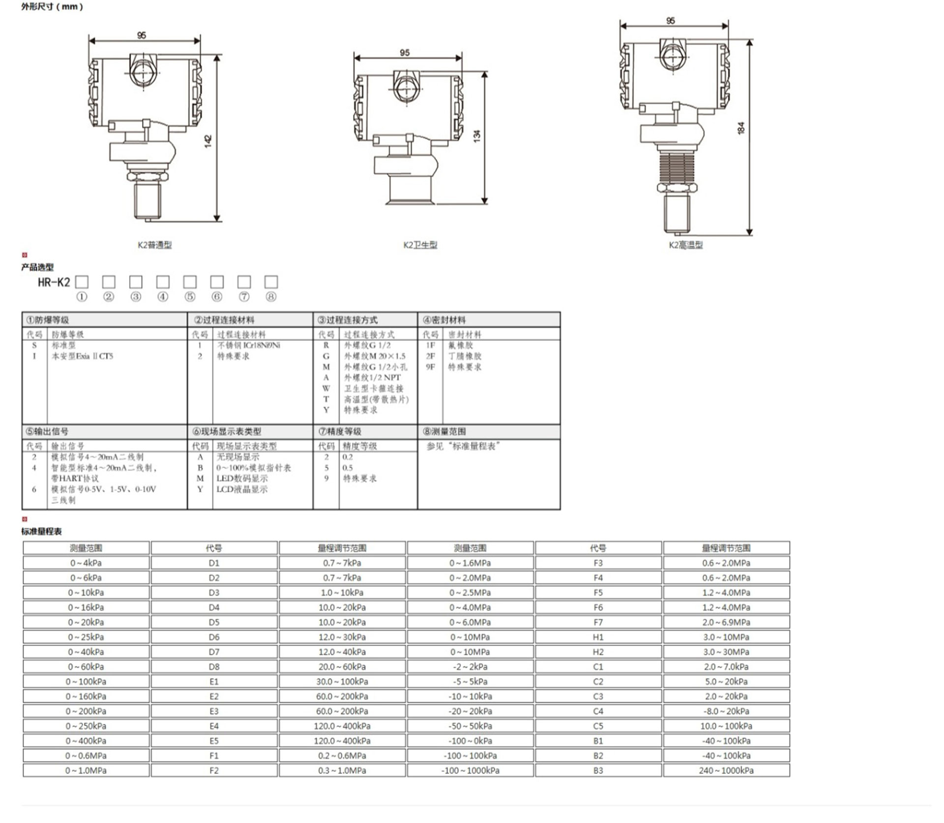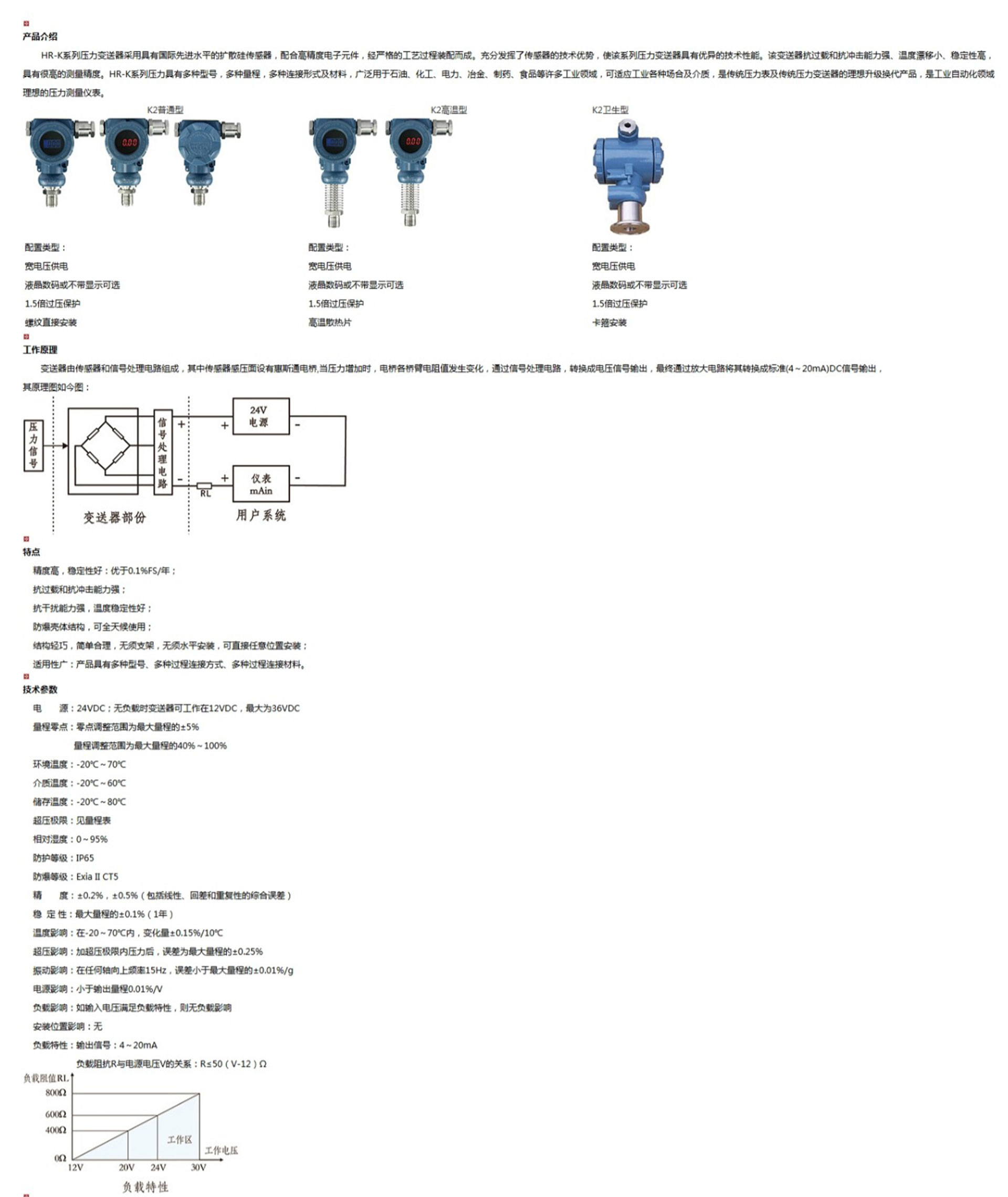 HR-K系列壓力變送器采用具有國際先進水平的擴散硅傳感器,配合高精度電子元件,經嚴格的工藝過程裝配而成。充分發(fā)揮了傳感器的技術優(yōu)勢,使該系列壓力變送器具有優(yōu)異的技術性能。該變送器抗過載和抗沖擊能力強、溫度漂移小、穩(wěn)定性高,具有很高的測量精度。