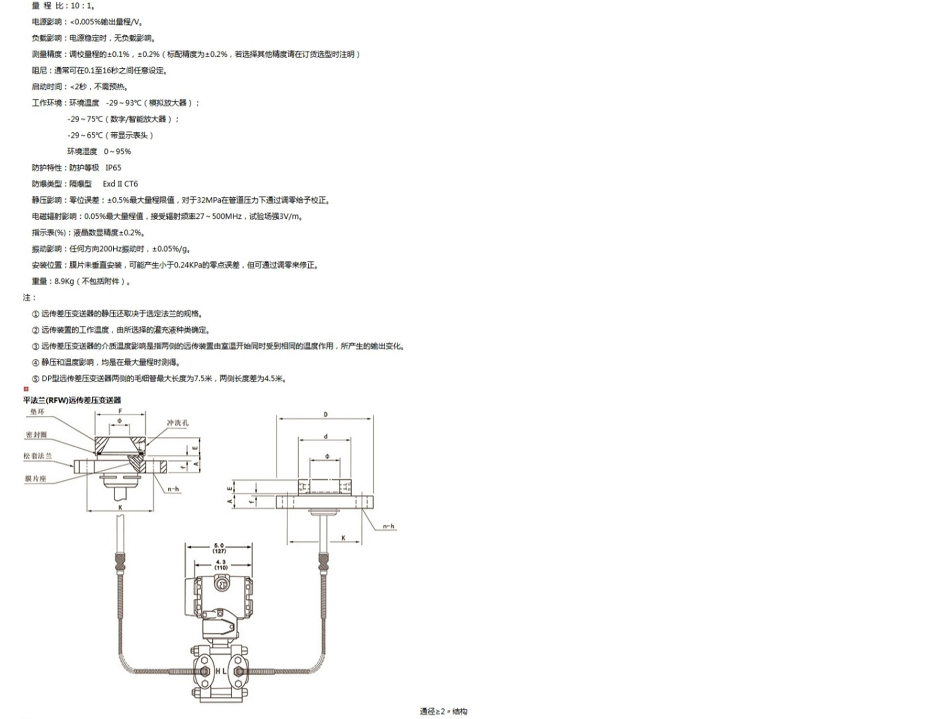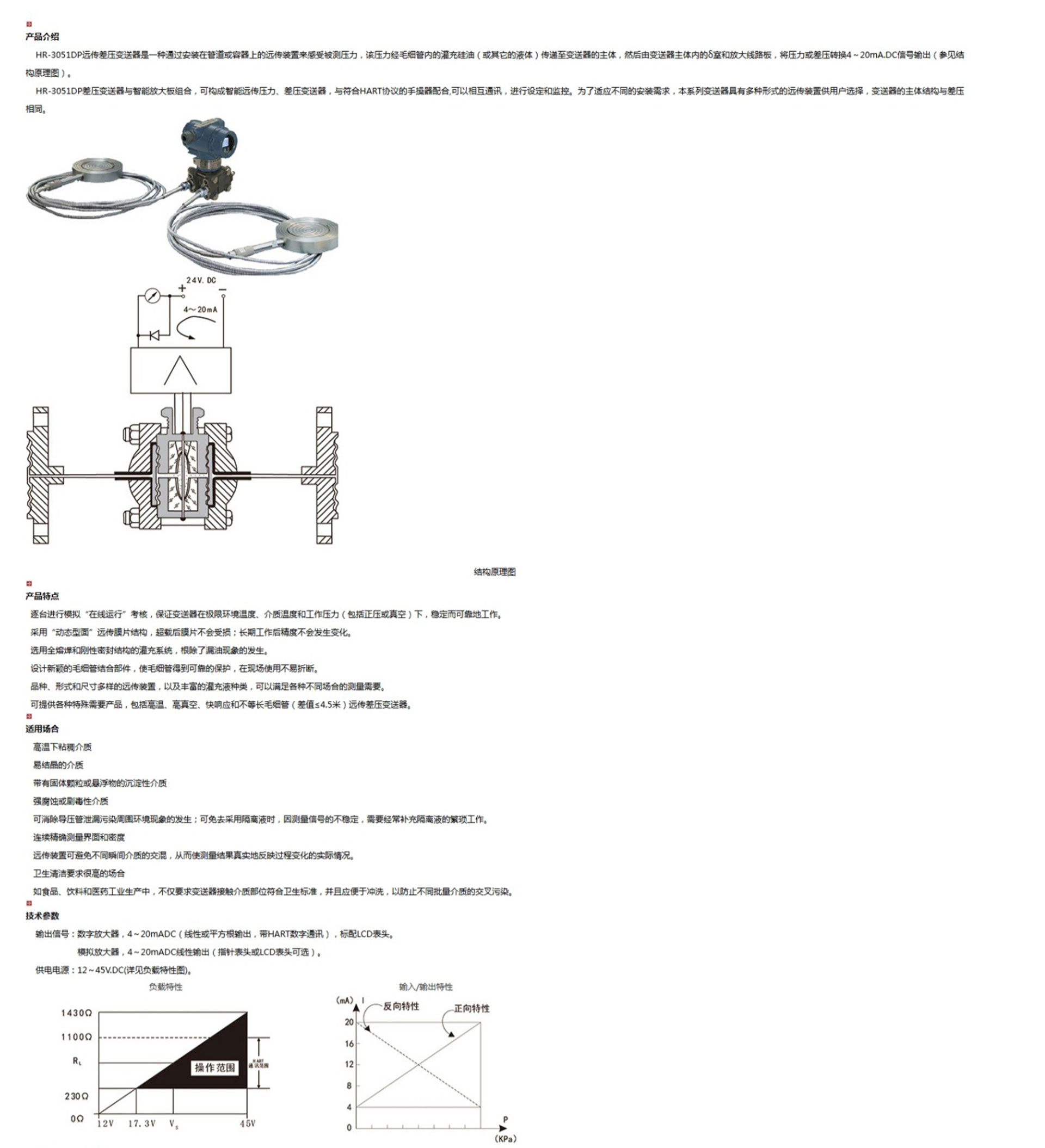 HR-3051DP遠傳差壓變送器是一種通過安裝在管道或容器上的遠傳裝置來感受被測壓力,該壓力經(jīng)毛細管內的灌充硅油(或其它的液體)傳遞至變送器的主體,然后由變送器主體內的δ室和放大線路板,將壓力或差壓轉換4~20mA.DC信號輸出。