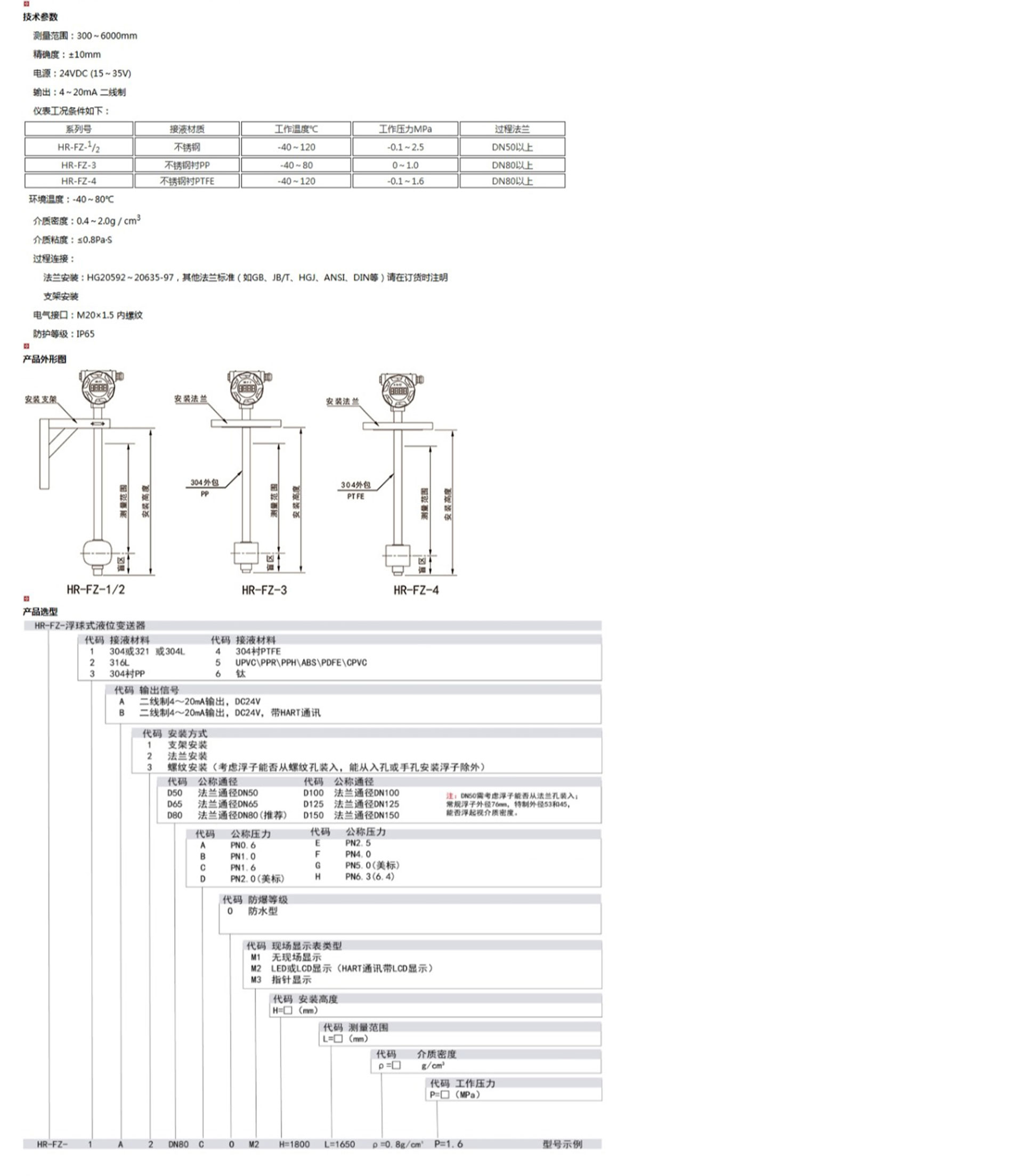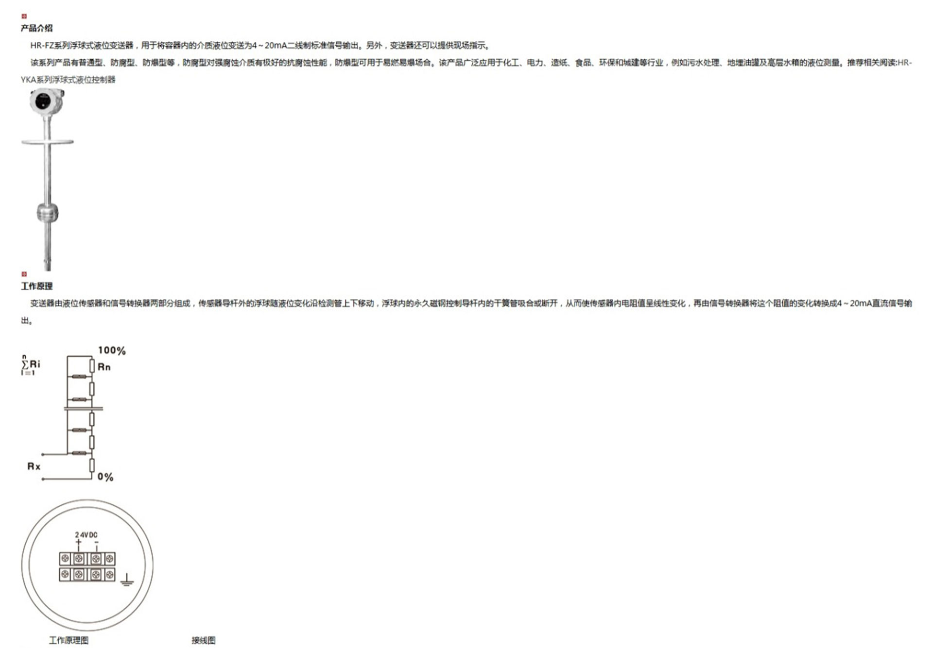 HR-FZ系列浮球式液位變送器,用于將容器內(nèi)的介質(zhì)液位變送為4~20mA二線制標(biāo)準(zhǔn)信號(hào)輸出。另外,變送器還可以提供現(xiàn)場(chǎng)指示。